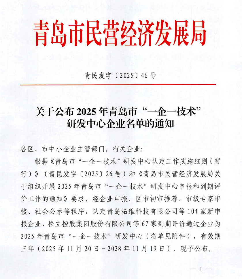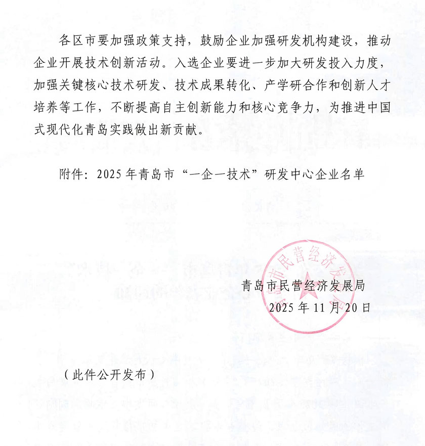 根据《青岛市“一企一技术”研发中心认定工作实施细则》和《青岛市民营经济发展局关于组织开展2025年青岛市“一企一技术”研发中心申报和到期评价工作的通知》要求,经企业申报、区市初审推荐、市级专家评审、社会公示等程序,认定名单日前已经公布,青岛东佳集团榜上有名。